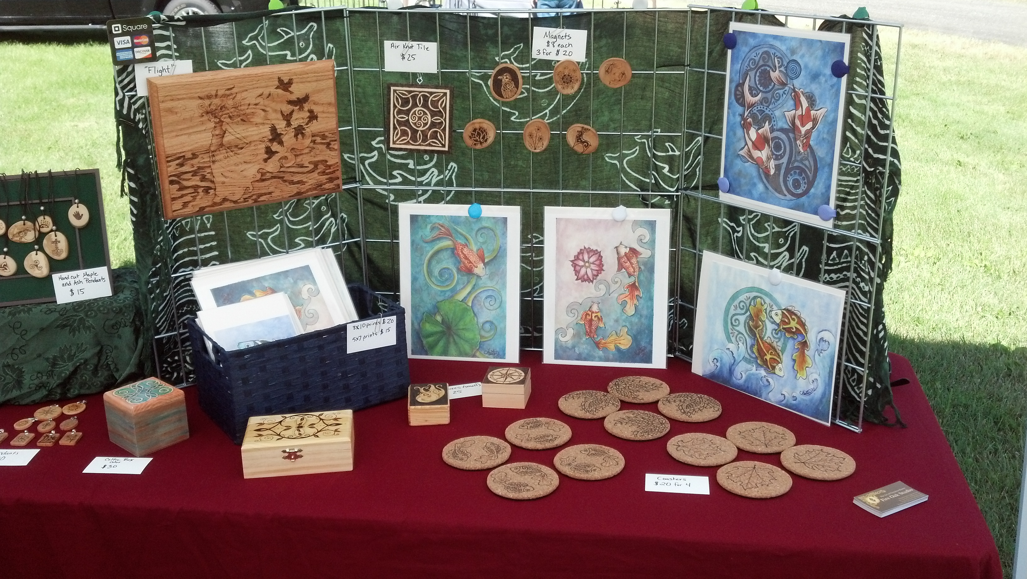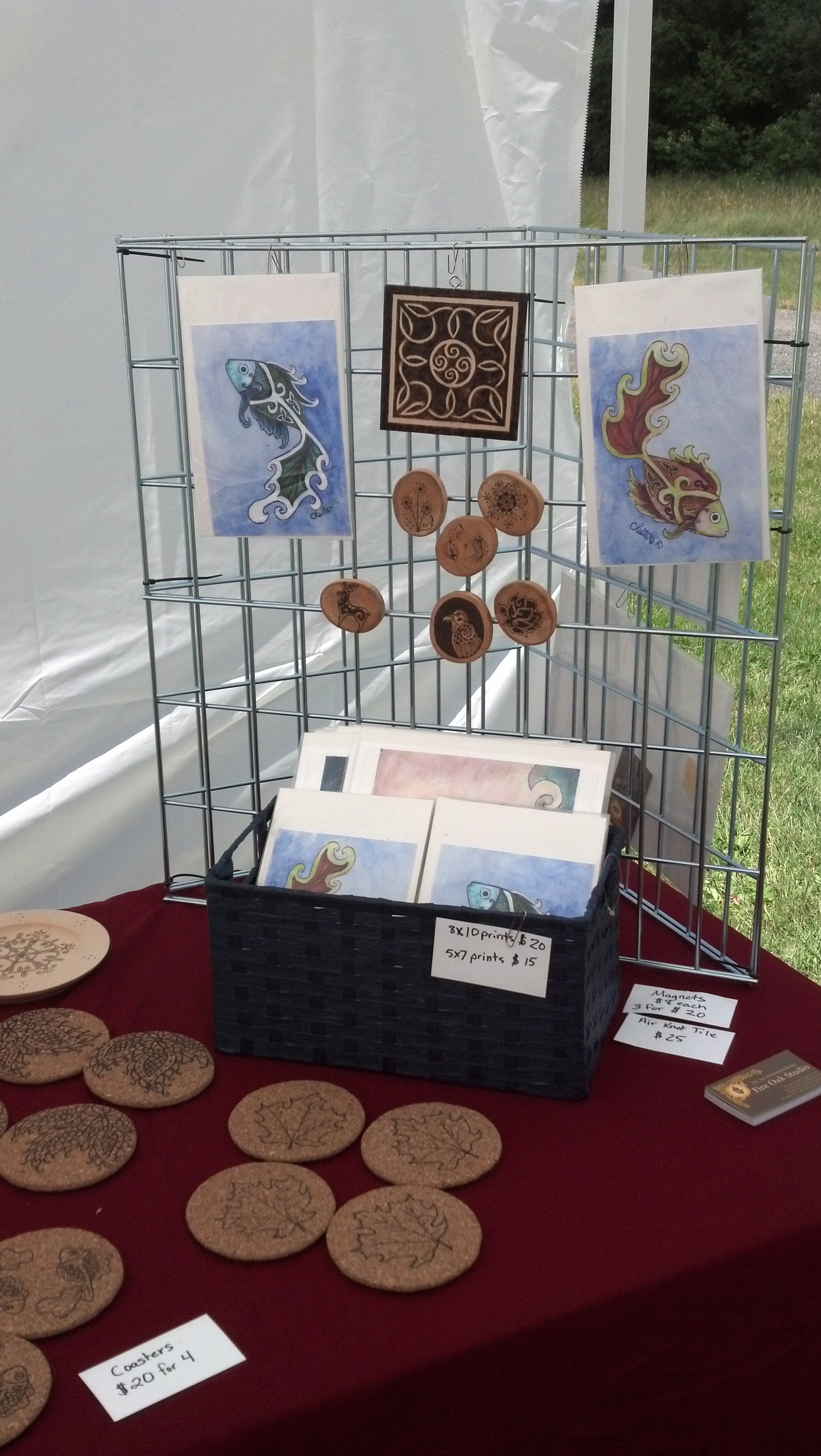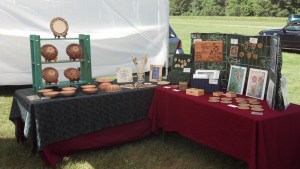 First, it is windy outside. If you have a tent anchor it. Luckily, mine was adequately anchored for the light wind we had today. My display, however, was not. I work with wood. Wood is actually pretty light. Some of my bowls took flight. None were damaged, thankfully. The other problem with my display was with the metal grid I use to hang some of my pieces from.