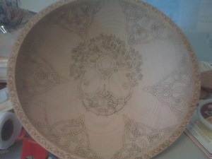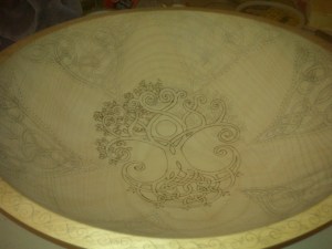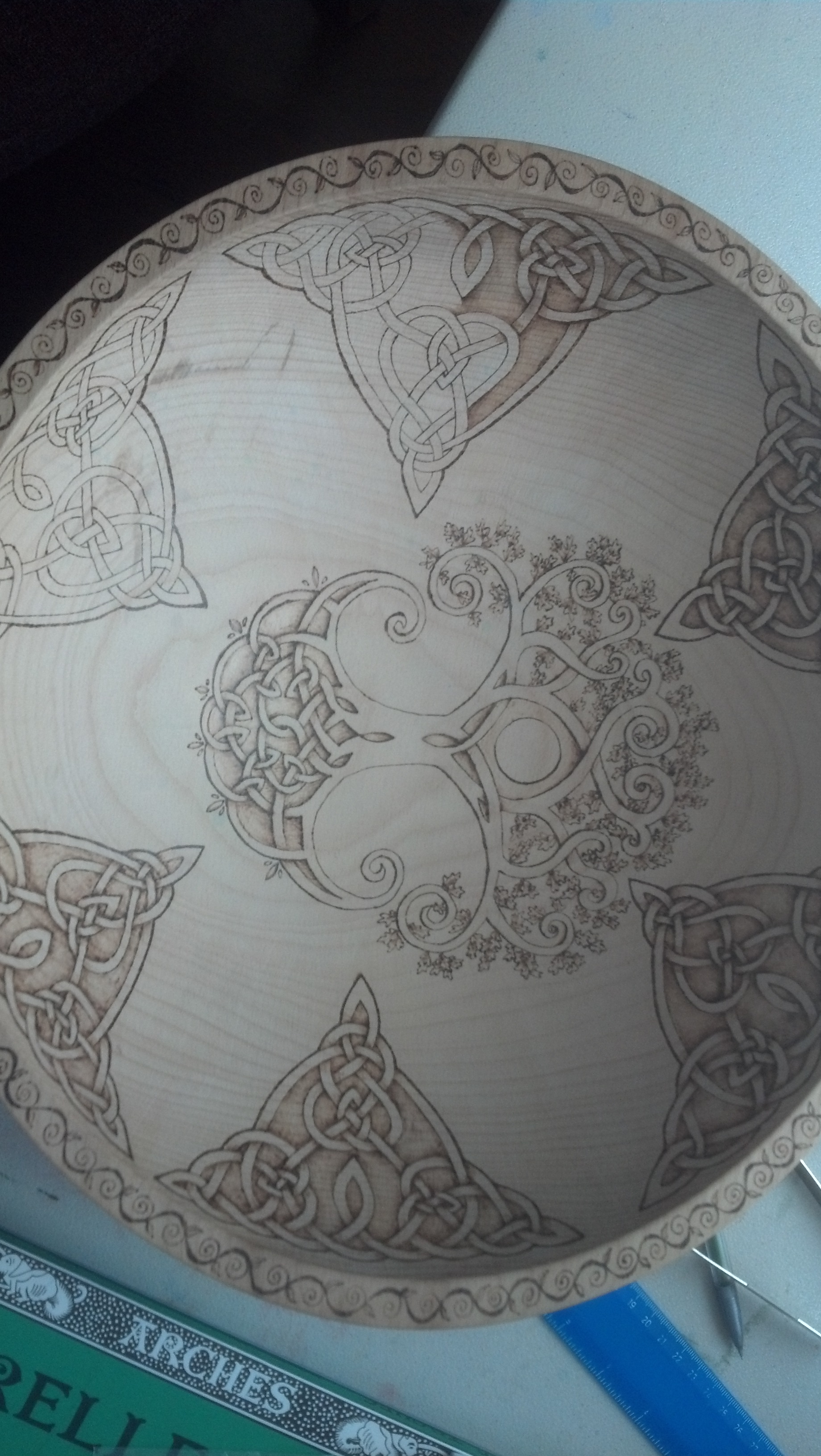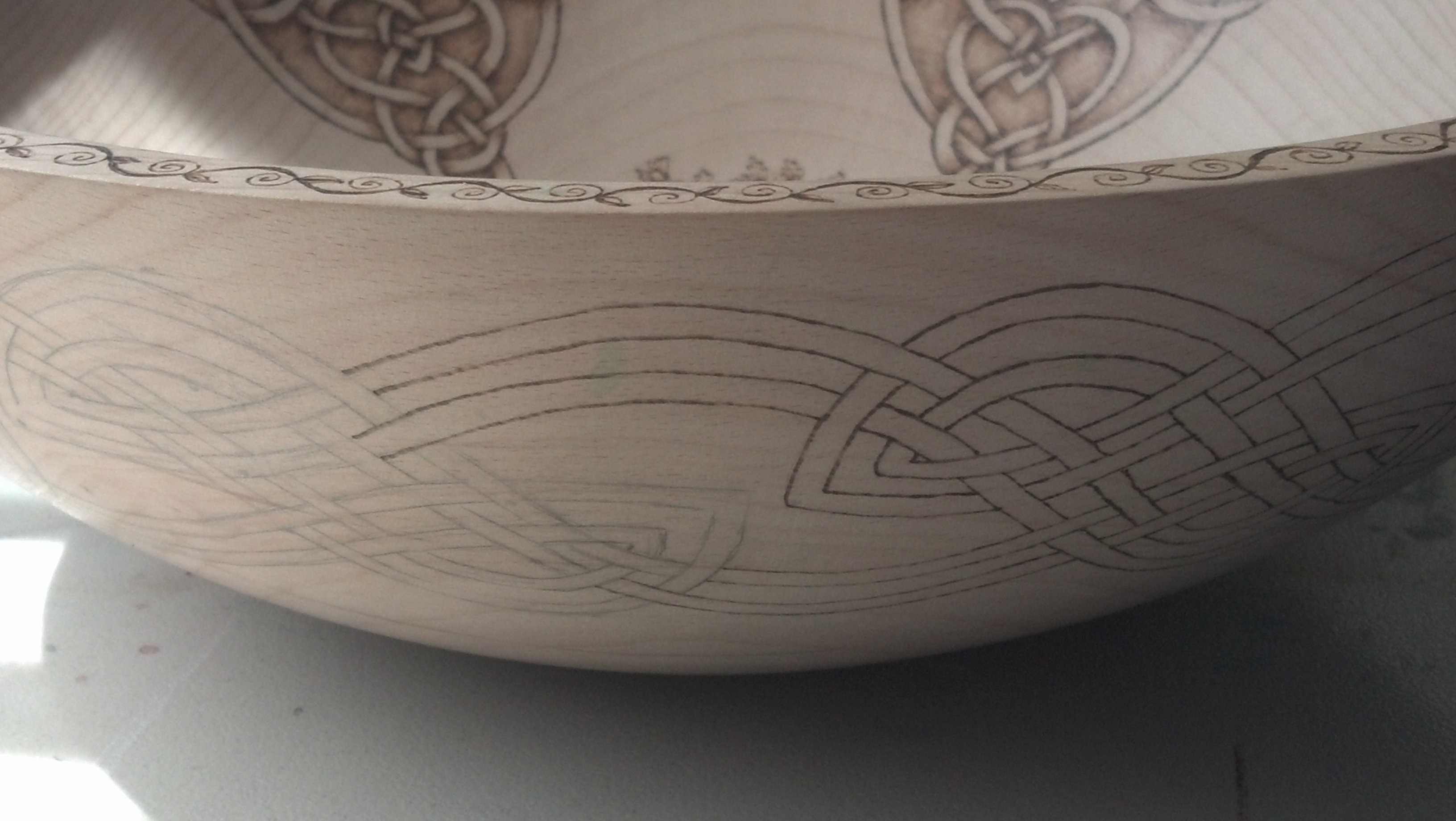 I have been working on it, when my schedule allows, since the end of last year. It is a large bowl, 15 inches. It took me probably 2 hours just to draw the inside of the bowl and 1.5 hours to draw the design on the outside of the bowl. After drawing in pencil, I go over my lines with my pyrography tool. for most lines I use a writing tip.